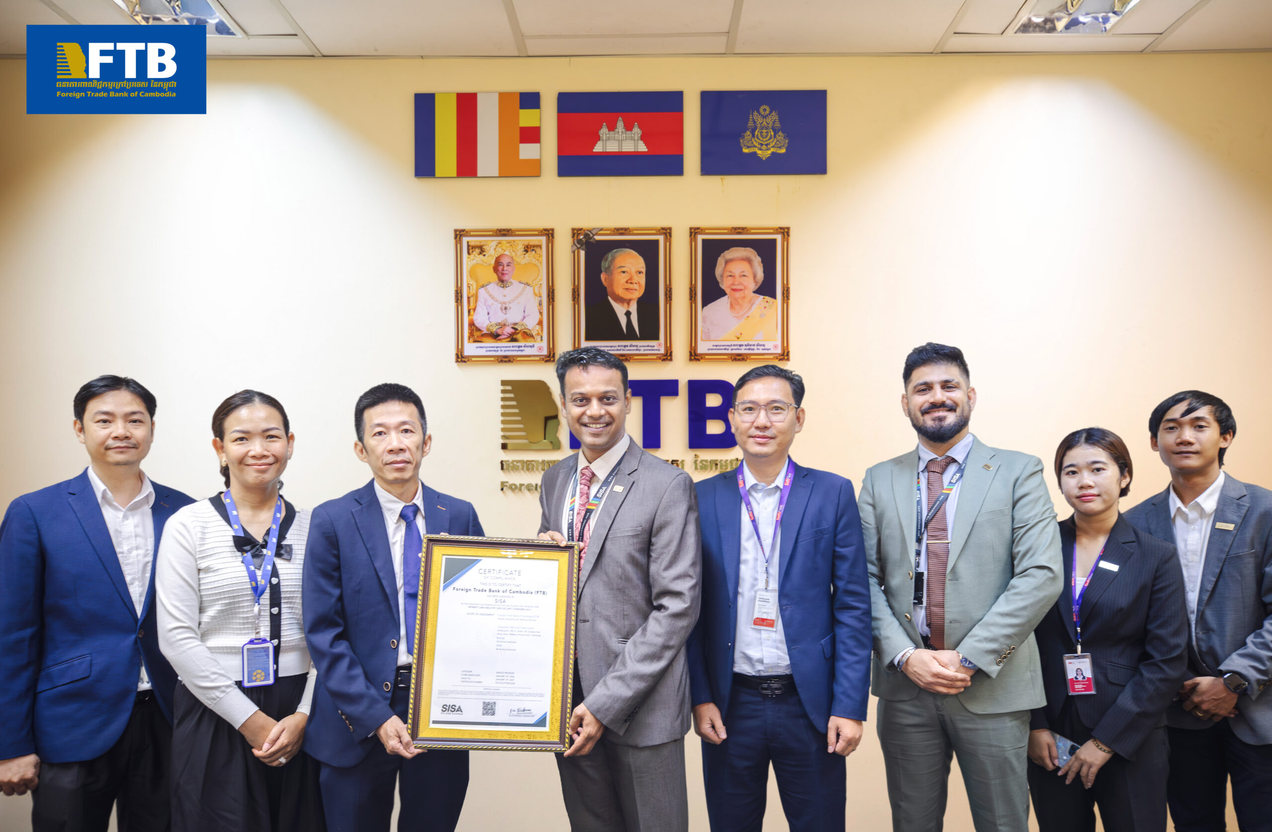 Phnom Penh – Foreign Trade Bank of Cambodia (FTB), the first commercial bank in Cambodia trusted since 1979, has officially achieved PCI DSS Compliance, further reinforcing its commitment to payment security standards and customer data protection. The certification ceremony was held on February 25, 2026, at FTB’s headquarters, presided over by the FTB management, SISA Information Security Pte. Ltd. and SoftFlex Solutions Co., Ltd. management.